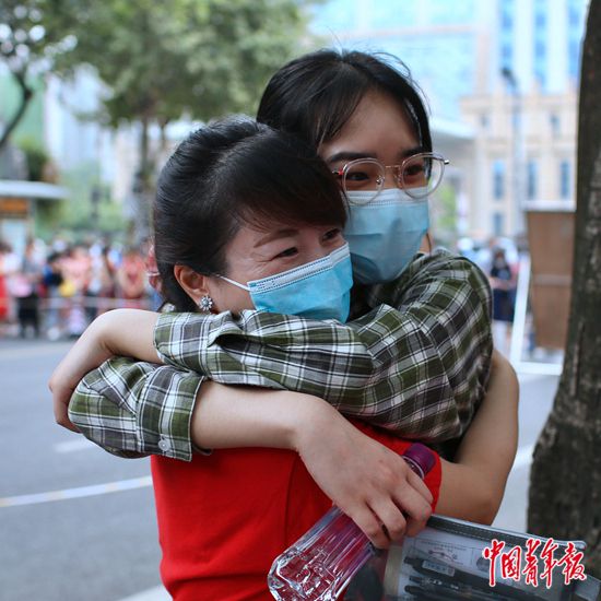 7月7日上午,四川省成都市,成都七中考點門口,一名考生進入考場前與老師擁抱。汪龍華/攝