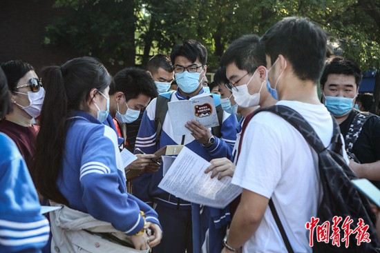 7月7日上午,北京市中國人民大學附屬中學朝陽學校(東校區(qū))門口,考生們在進入考場前抓緊時間看復習資料。中青報·中青網見習記者 孔斯琪/攝