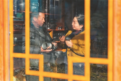 在德格縣麥宿鎮(zhèn)的扎堪倉黑陶工坊,達瓦卓瑪(右)向工坊主理人降擁格乃了解工坊近期的經營情況以及新品研制進展。新華社記者 沈伯韓攝