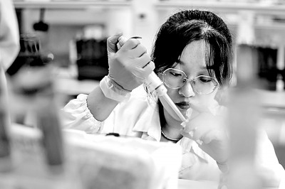 上海海洋大學水產養(yǎng)殖專業(yè)的博士研究生王賀在導師指導下研究遺傳育種。新華社發(fā)