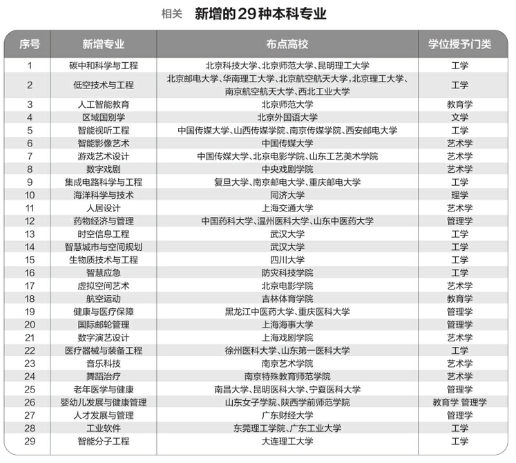 據(jù)悉,此次增設的29種新專業(yè),充分體現(xiàn)國家戰(zhàn)略、市場需求和科技發(fā)展牽引,在服務國家戰(zhàn)略方面,增設了區(qū)域國別學、碳中和科學與工程、海洋科學與技術、健康與醫(yī)療保障等專業(yè);面向科技發(fā)展前沿,增設了智能分子工程、醫(yī)療器械與裝備工程、時空信息工程等專業(yè);主動適應市場需求,增設了國際郵輪管理、航空運動等專業(yè)。同時,聚焦人工智能賦能經(jīng)濟社會發(fā)展,增設人工智能教育、智能視聽工程、數(shù)字戲劇等專業(yè)。