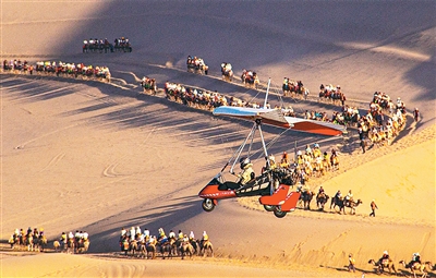 近年來,在甘肅省敦煌市鳴沙山月牙泉景區(qū)運(yùn)營的敦煌“飛天”通用航空項(xiàng)目,為游客提供低空飛行器旅游服務(wù),讓游客乘坐直升機(jī)、動(dòng)力滑翔機(jī),從空中欣賞大漠綠洲和月牙泉美景,沉浸式體驗(yàn)敦煌獨(dú)特魅力。圖為7月3日,游客乘坐滑翔機(jī)空中俯瞰敦煌大漠風(fēng)光。王斌銀攝(人民視覺)