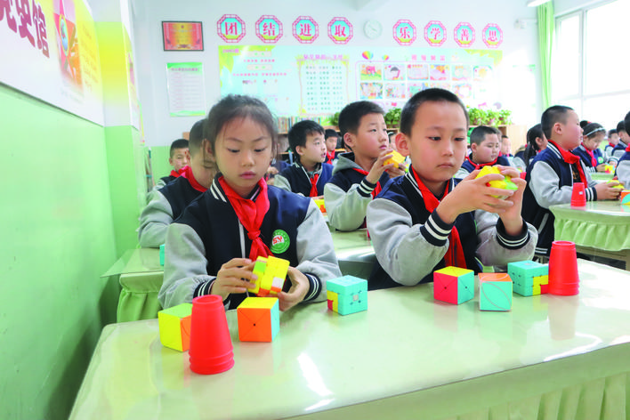 冬日暖陽(yáng)下,忻州市實(shí)驗(yàn)小學(xué)校園里一派生機(jī)勃勃的景象。武術(shù)訓(xùn)練場(chǎng)上,孩子們正在認(rèn)真扎馬步、練拳術(shù),一招一式打得虎虎生威,眼睛里閃爍著堅(jiān)毅和自信的光芒。百人腰鼓隊(duì)排著整齊的隊(duì)伍,伴著音樂的節(jié)奏不停變換著步伐,鼓槌上的紅綢子上下舞動(dòng),看得人眼花繚亂?;ㄊ交@球挑戰(zhàn)籃球極限,展示籃球技術(shù)和表演的完美結(jié)合?;犹K中,孩子們?cè)诃h(huán)擺的繩索中做著各種跳躍動(dòng)作……操場(chǎng)上,熱火朝天,教學(xué)樓里,每一間教室里都散發(fā)著濃濃的趣味性?!耙黄惨晦?,書寫堂堂正正中國(guó)字”“編程要注意邏輯關(guān)系”“三原色是哪些顏色呢?”……這是市實(shí)驗(yàn)小學(xué)每周三開展的第二課堂綜合實(shí)踐活動(dòng),也是孩子們最興奮最高興的校園時(shí)光。