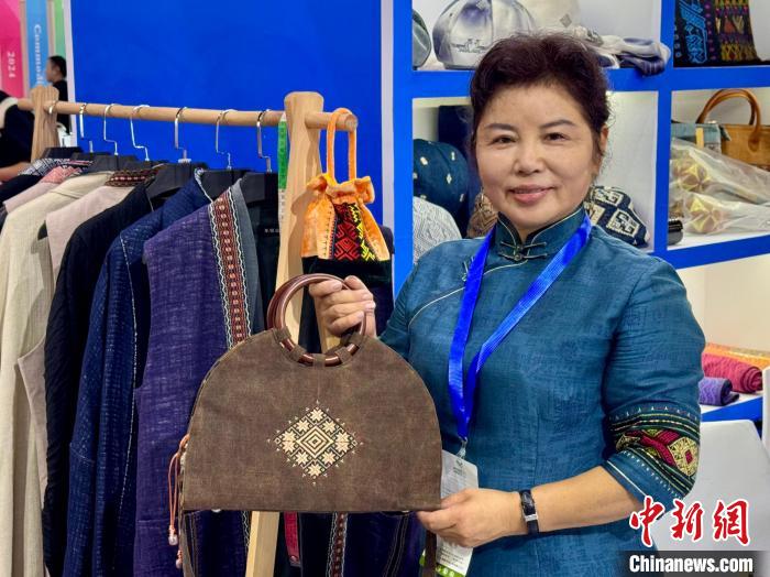 10月13日,來自海南的琴韻幽蘭品牌設(shè)計師王彬妮展示黎錦元素面料制成的產(chǎn)品。董易鑫 攝
