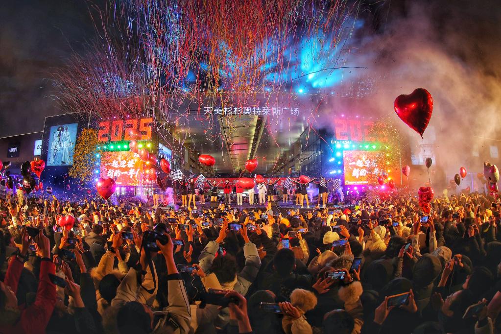 “五、四、三、二、一!”晉中天美杉杉奧特萊斯購物廣場的88臺高空禮炮噴射彩帶,將跨年夜的氛圍引至高潮。