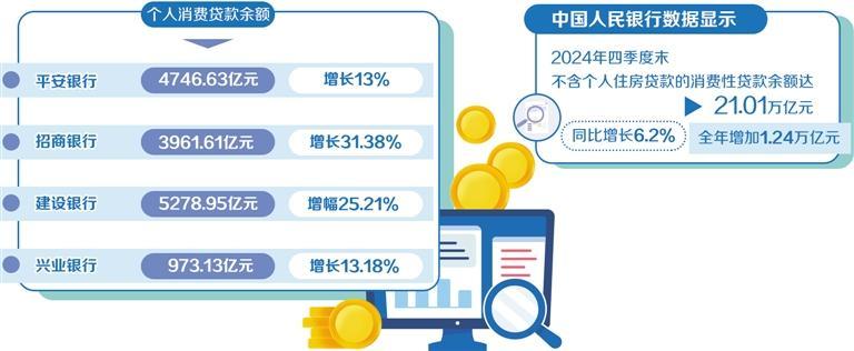 2024年,上市銀行零售業(yè)務普遍進入調(diào)整期,消費貸業(yè)務增長強勁。在擴內(nèi)需、促消費的背景下,消費貸成為零售業(yè)務的新增長點。中國人民銀行數(shù)據(jù)顯示,2024年四季度末,不含個人住房貸款的消費性貸款余額達21.01萬億元,同比增長6.2%,全年增加1.24萬億元。多家銀行在2024年年報中披露的個人消費貸款數(shù)據(jù)有明顯增長。其中,平安銀行個人消費貸款余額4746.63億元,同比增長13%;招商銀行個人消費貸款余額3961.61億元,較上年末增長31.38%;中國農(nóng)業(yè)銀行含信用卡在內(nèi)的個人消費貸款余額1.3萬億元,新增2943億元,增速28.3%;中國建設銀行境內(nèi)個人消費貸款余額5278.95億元,增幅25.21%;興業(yè)銀行個人消費貸款余額973.13億元,較上年末增長13.18%。南開大學金融學教授田利輝表示,隨著國家提振消費政策的出臺,銀行零售業(yè)務有望逐步提速。消費貸業(yè)務有望在政策支持下繼續(xù)增長,成為銀行重要的利潤來源。