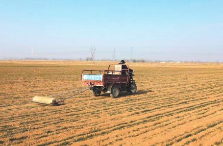 管護(hù)工人熟練地操作著磙子將麥田壓實(shí)