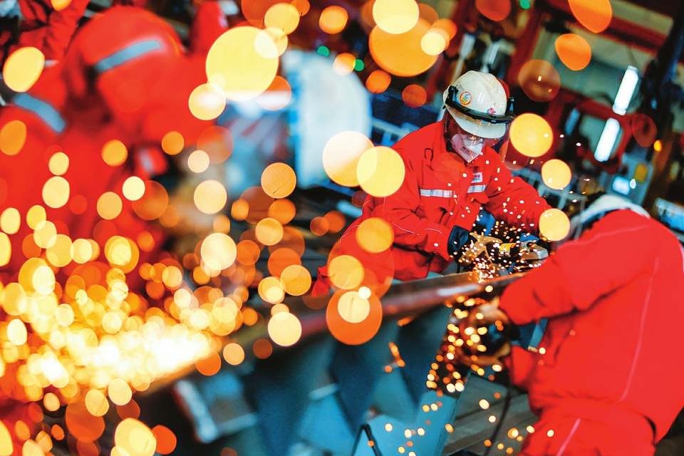 1月19日,在天津市濱海新區(qū),海上油氣平臺(tái)建設(shè)工人進(jìn)行打磨作業(yè)。