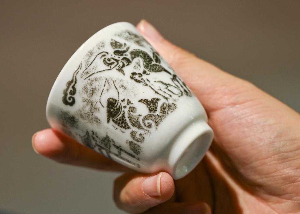 在浙江臺州仙居縣白塔鎮(zhèn)上葉村仙居巖畫藝術(shù)中心內(nèi),工作人員展示根據(jù)當?shù)貛r畫開發(fā)的文創(chuàng)禮品(7月28日攝)。新華社記者 李賀 攝