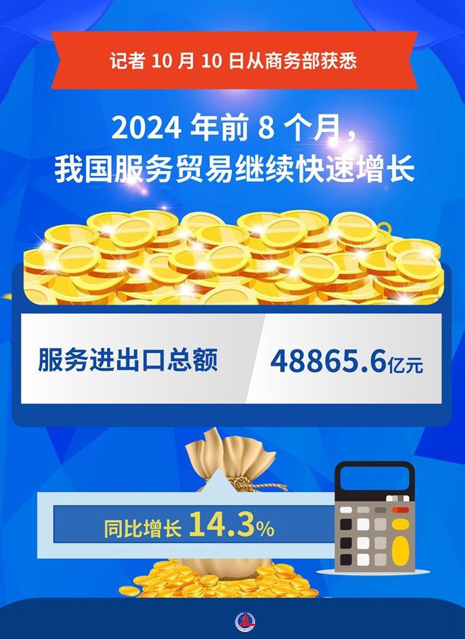 新華社北京10月10日電(記者謝?,帲┯浾?0日從商務部獲悉,今年前8個月,我國服務貿(mào)易繼續(xù)快速增長,服務進出口總額48865.6億元,同比增長14.3%。