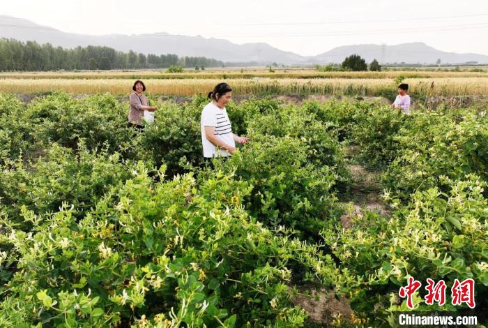 山西省運城市新絳縣澤掌鎮(zhèn)喬溝頭村,花農(nóng)采摘喜獲豐收的金銀花。高新生 攝