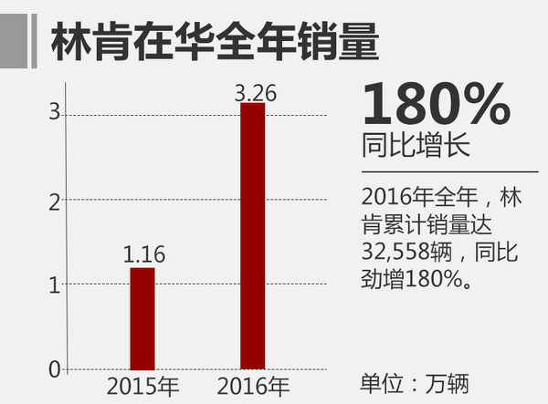 在陸續(xù)引入四款新車后,隨著產(chǎn)品線的逐漸豐富,開始走“親民”路線的林肯在重回中國市場(chǎng)后銷量大幅攀升。較之2015年的11,630輛,2016年全年林肯累計(jì)銷量達(dá)32,558輛,同比勁增180%,其增速成為中國成長最快的豪華品牌。在第四季度,林肯單月銷量達(dá)11,562輛,占全年銷量的35.5%,同比增幅162%。