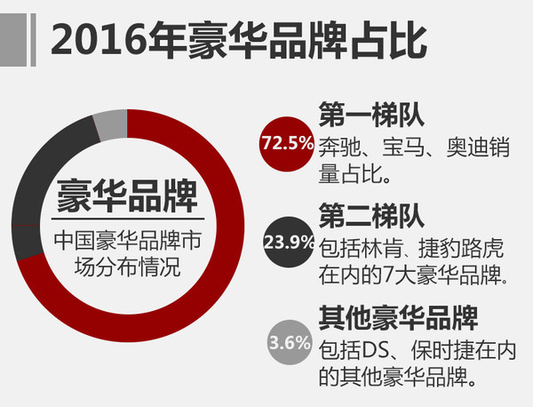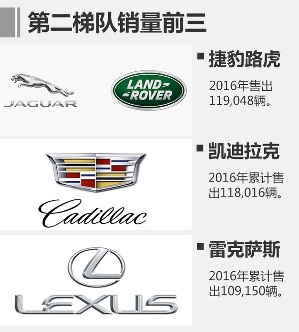 而包括捷豹路虎、凱迪拉克、雷克薩斯、沃爾沃、英菲尼迪、林肯和謳歌組成的豪華品牌第二梯隊(duì),2016年總銷量為520,354輛,占整個(gè)豪華車市場(chǎng)23.9%。注:保時(shí)捷品牌定位問題,不算在第二梯隊(duì)內(nèi)。