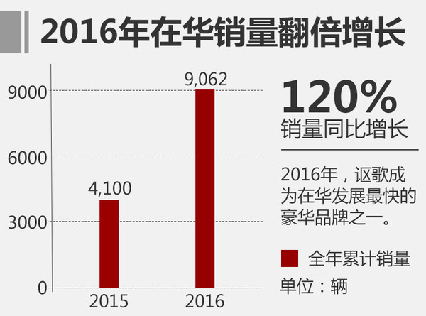 由于此前在華的產(chǎn)品投入等多方問題,入華已經(jīng)達(dá)到10年的本田高端品牌謳歌,銷量并沒有得到顯著提升,2015年謳歌在中國市場(chǎng)的新車上牌量?jī)H為4,100輛,數(shù)據(jù)并不美麗。2016年謳歌重整旗鼓,制定完善的在華戰(zhàn)略,推出首款國產(chǎn)車型CDX后其銷量得到明顯提升,2016年累計(jì)售出9,062輛,同比大增120%,成為增速第二快的豪華品牌。