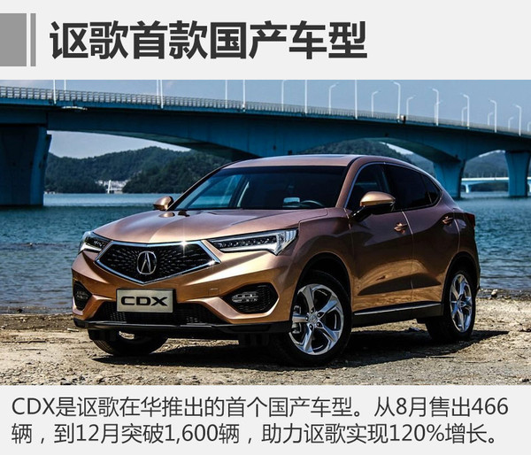 2016年7月,首款國(guó)產(chǎn)車型CDX正式上市,新車定位緊湊型SUV,同時(shí)也是謳歌產(chǎn)品體系中級(jí)別最小SUV車型。CDX上市后逐漸得到市場(chǎng)的認(rèn)可,從8月份的466輛,增長(zhǎng)至11月份的1,110輛,12月更是突破1,600輛。