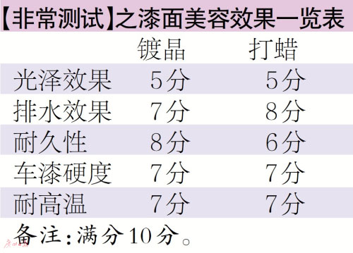 車天下君在兩塊車身試驗(yàn)面板上進(jìn)行測(cè)試,一塊鍍晶,一塊打蠟。全部按照說明書手工操作。車天下君是個(gè)理工男,做這些事情還算是輕車熟路。完工對(duì)比光澤效果,在都沒有拋光處理的情況下,鍍晶和打蠟都沒有起到提升漆面光澤的效果,給予“不及格”的差評(píng)。潑上水,漆面都形成水珠,但仔細(xì)比較,會(huì)發(fā)現(xiàn)打蠟的排水效果比鍍晶要好。