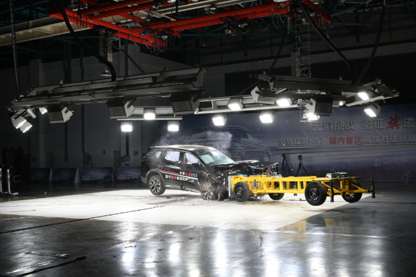 本次碰撞試驗(yàn),在中國(guó)汽車技術(shù)研究中心實(shí)車碰撞實(shí)驗(yàn)室進(jìn)行。經(jīng)過鹽水噴淋試驗(yàn)后的全新紅旗HS7與試驗(yàn)臺(tái)車,以100km/h的相對(duì)速度,進(jìn)行車輛正面副駕駛側(cè)50%對(duì)碰。