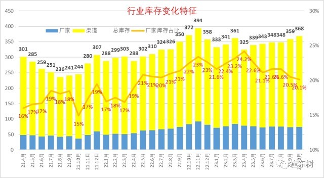 根據(jù)乘聯(lián)會(huì)的數(shù)據(jù),2023年10月月末全國(guó)乘用車(chē)庫(kù)存368萬(wàn)臺(tái),其中廠家?guī)齑?4萬(wàn)臺(tái),渠道庫(kù)存294萬(wàn)臺(tái),廠家?guī)齑嬲急?0.1%,較2022年10月下降1.9個(gè)百分點(diǎn),環(huán)比上月下降0.4個(gè)百分點(diǎn)。