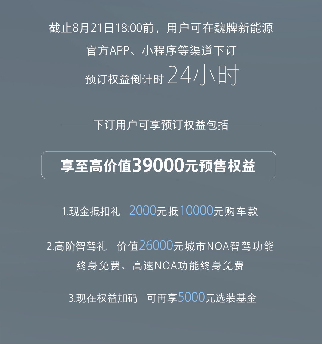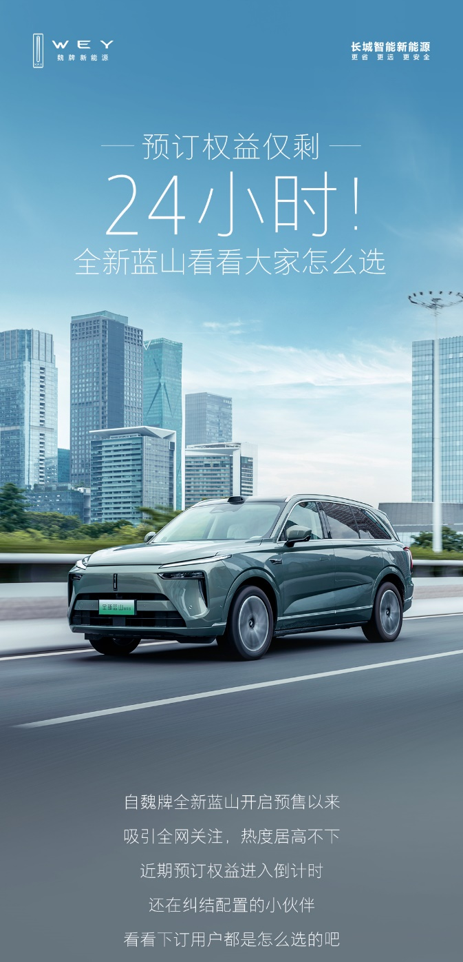 8月21日魏牌全新藍山上市,預訂權益正式進入倒計時,截至8月21日18:00前,可以在魏牌新能源官方APP、小程序等渠道下訂。下訂用戶可享至高價值39000元預售權益,含現金抵扣禮(2000元抵10000元購車款),高階智駕禮(價值26000元城市NOA智駕功能終身免費,高速NOA功能終身免費),現在還有現時權益加碼,可再享5000元選裝基金。還在糾結配置的用戶,抓緊下訂吧。