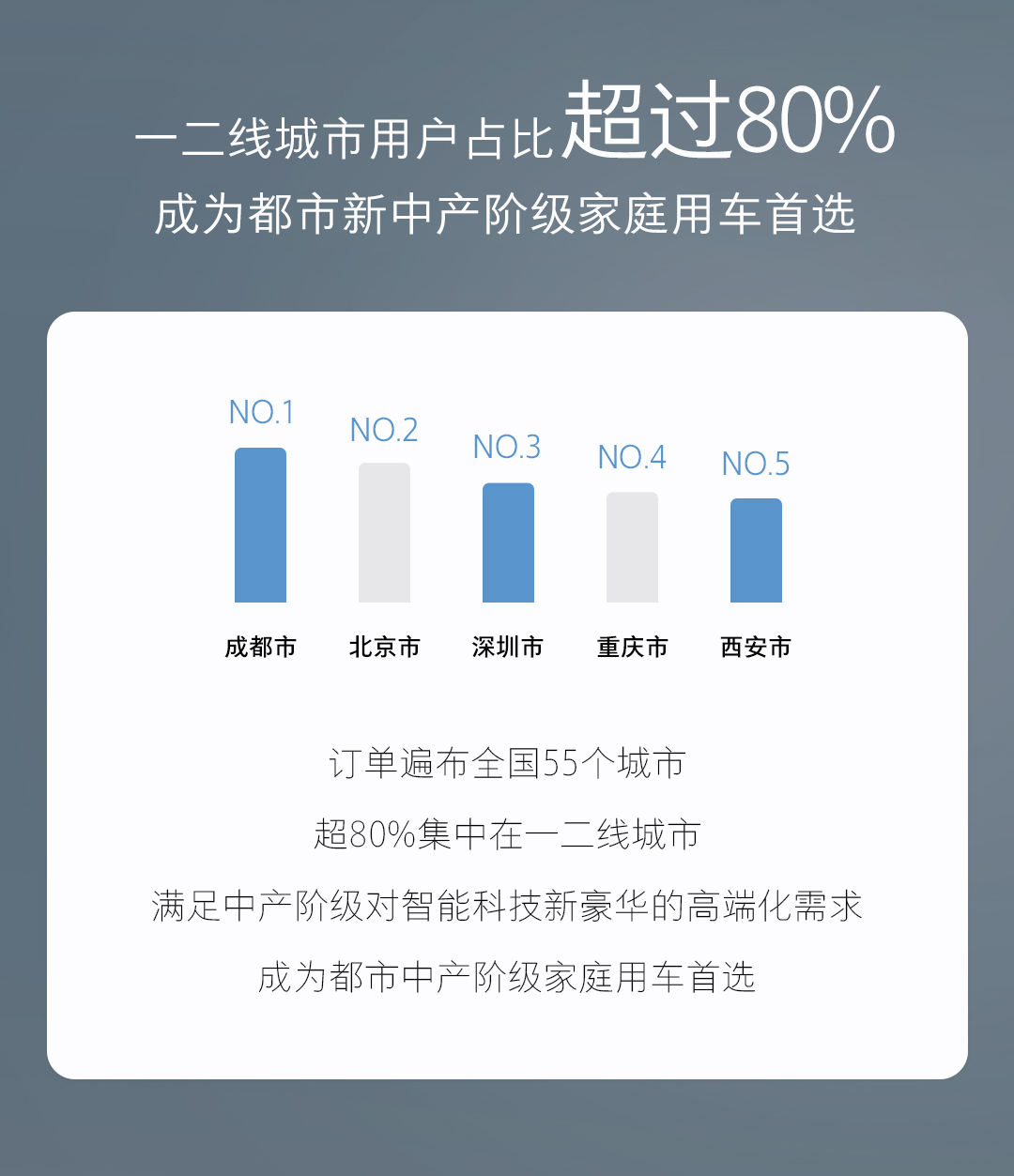 全新藍山的訂單已覆蓋全國55個城市,主要集中在成都、北京、深圳、重慶、西安等一二線城市,不僅彰顯了這些都市精英人群對高端智能出行方式的追求,更體現了其對智能駕駛和奢華配置的高要求。