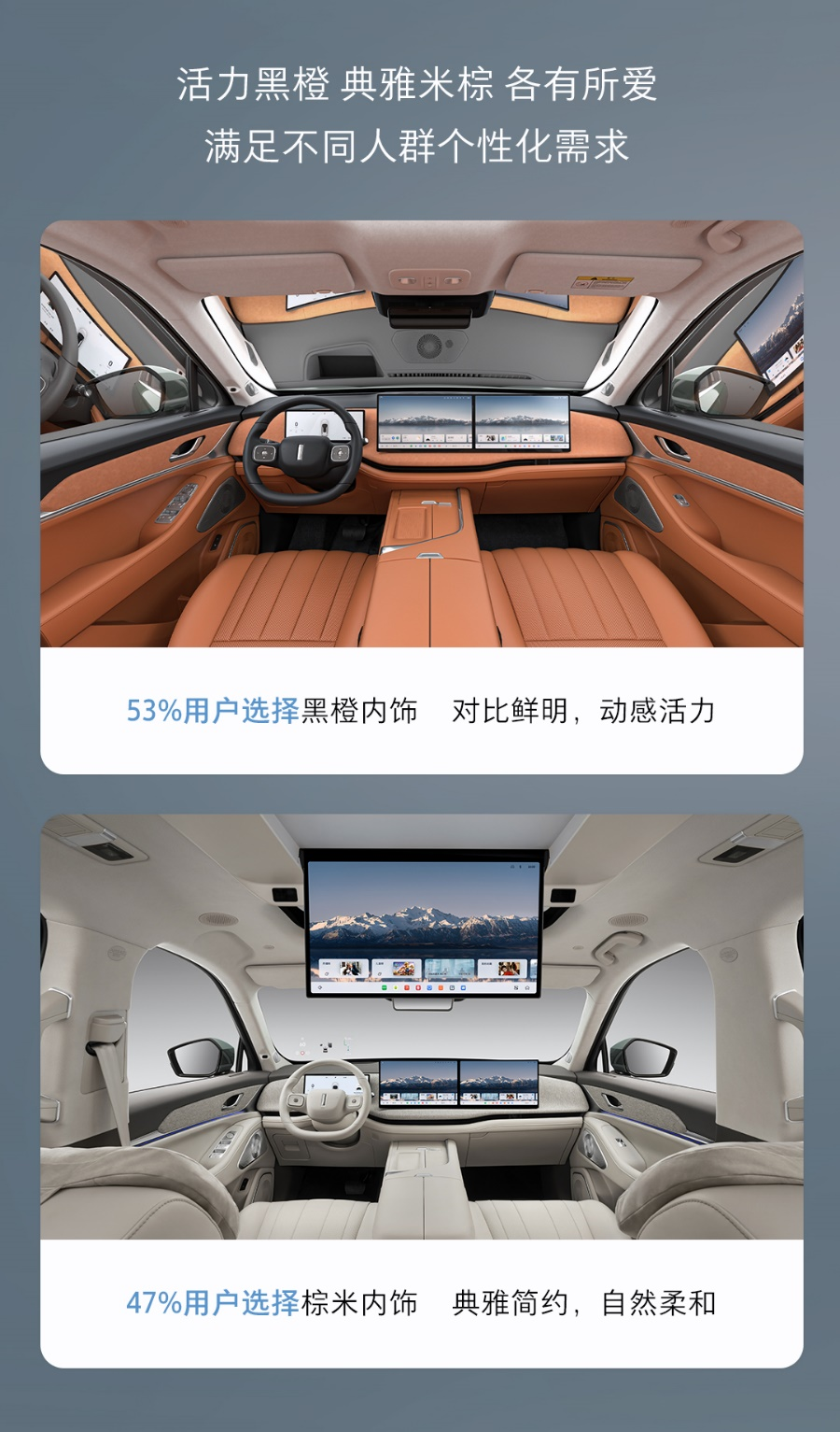 在內飾方面,黑橙搭配占比53%,既保留了黑色的神秘感,又融入了橙色的活力元素,整體風格不失優(yōu)雅大氣,又充滿動感與生機,彰顯出對比鮮明、溫暖陽光的空間氛圍;棕米內飾則以47%的占比,為車艙營造一抹精致與高雅,高級質感,一眼望去平和寧靜,營造出自然柔和的家庭氛圍,同樣符合更多用戶的審美需求。