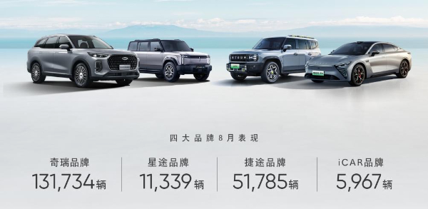 從品牌來看:四大主力乘用車品牌中,奇瑞品牌8月銷量131,734輛,1-8月累計(jì)銷量961,624輛,同比增長(zhǎng)34.8%;星途品牌8月銷量11,339輛,1-8月累計(jì)銷量80,229輛,同比增長(zhǎng)22%;捷途品牌8月銷量51,785輛,1-8月累計(jì)銷量316,446輛,同比增長(zhǎng)95.5%,這一數(shù)字已超過捷途去年全年銷量;iCAR品牌首款產(chǎn)品上市6個(gè)月,8月份銷量5,967輛;今年以來累計(jì)銷量37,681輛。