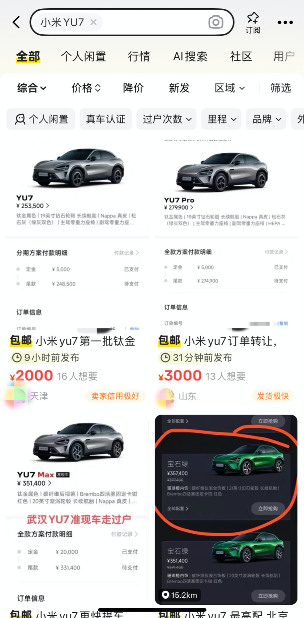 央廣網(wǎng)記者查閱某二手交易平臺(tái)發(fā)現(xiàn),自小米YU7上市后,該平臺(tái)已出現(xiàn)大量轉(zhuǎn)讓訂單信息,轉(zhuǎn)讓金額2000元-2萬(wàn)元不等。