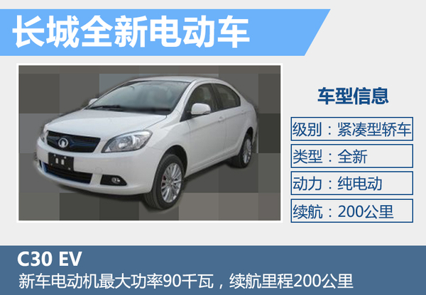 根據(jù)長城汽車此前公布消息,旗下首款純電動(dòng)轎車將于2016年上市。網(wǎng)通社獲得了一組長城全新電動(dòng)車型C30 EV的諜照及部分信息,新車外觀方面較燃油版車型在細(xì)節(jié)方面進(jìn)行調(diào)整,加入更多“EV”元素。新車搭載一臺(tái)功率為90千瓦的電動(dòng)機(jī),續(xù)航里程有望達(dá)到200公里。