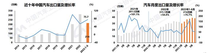 中汽協(xié)數(shù)據(jù)顯示,6月,汽車企業(yè)出口38.2萬輛,環(huán)比下降1.7%,同比增長53.2%。上半年,汽車企業(yè)出口214萬輛,同比增長75.7%。其中,新能源汽車出口53.4萬輛,同比增長1.6倍。
