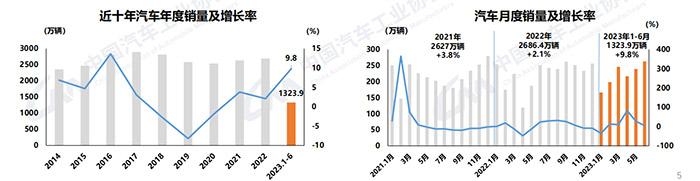 中汽協(xié)數(shù)據(jù)顯示,2023年6月,汽車產(chǎn)銷分別完成256.1萬輛和262.2萬輛,環(huán)比分別增長9.8%和10.1%,同比分別增長2.5%和4.8%。上半年,汽車產(chǎn)銷分別完成1324.8萬輛和1323.9萬輛,同比分別增長9.3%和9.8%。