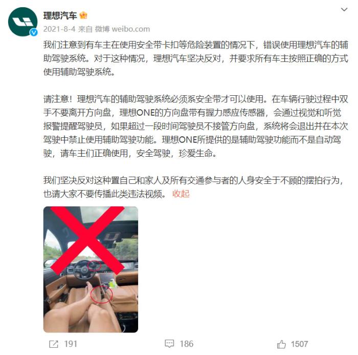 針對上述行為,理想汽車在2021年曾通過微博回應(yīng)稱,“理想汽車的輔助駕駛系統(tǒng)必須系安全帶才可以使用。在車輛行駛過程中雙手不要離開方向盤,理想ONE的方向盤帶有握力感應(yīng)傳感器,會通過視覺和聽覺報警提醒駕駛員,如果超過一段時間駕駛員不接管方向盤,系統(tǒng)將會退出并在本次駕駛中禁止使用輔助駕駛功能。”