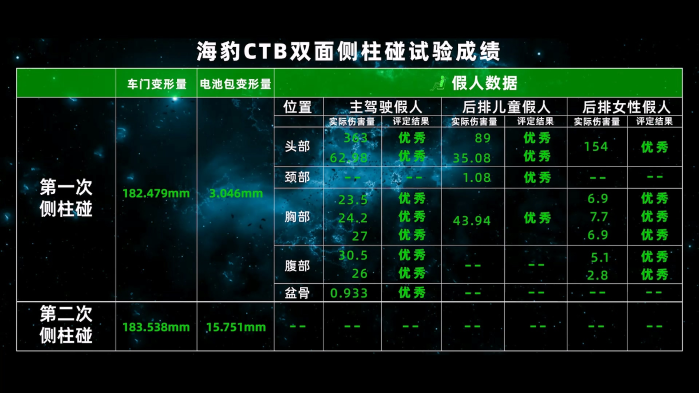 搭載CTB電池車身一體化技術(shù)的比亞迪海豹在TOP Safety雙面?zhèn)戎鲈囼?yàn)中,挑戰(zhàn)了主駕駛側(cè)柱碰試驗(yàn),副駕駛后排側(cè)柱碰試驗(yàn),以及兩次側(cè)柱碰后的電池包復(fù)用試驗(yàn),順利通過了挑戰(zhàn)。