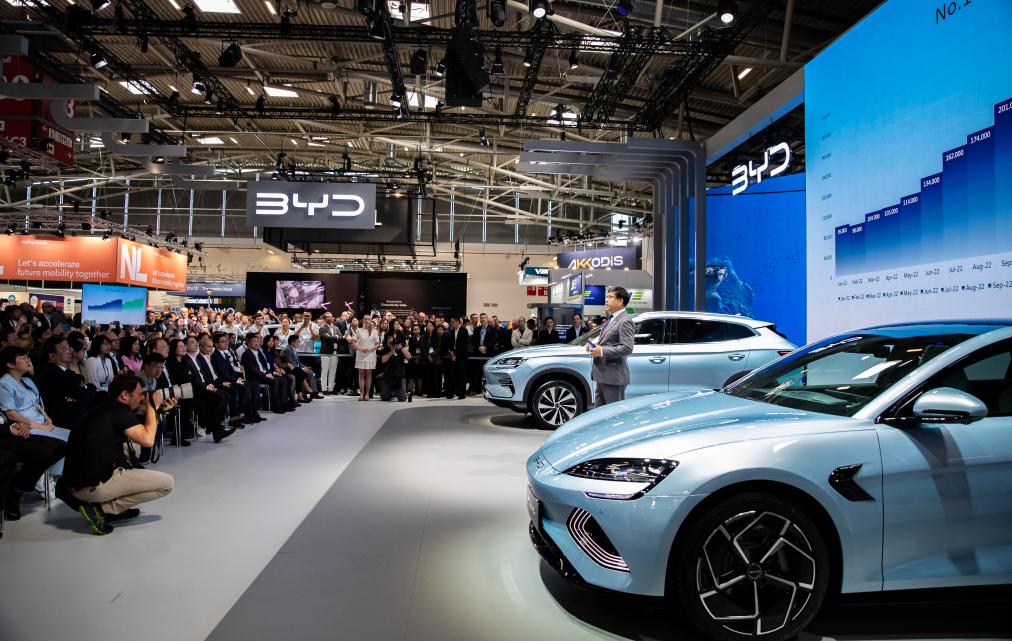 這是9月4日在德國慕尼黑國際車展媒體預展上拍攝的比亞迪發(fā)布會現(xiàn)場。新華社記者張帆攝