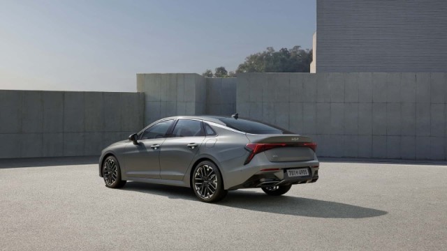 新車側(cè)面造型較為流暢,略微向下傾斜的車頂線條一直延伸至尾部,搭配鍍鉻飾條進行點綴時尚感較強。與此同時,新款K5還配備全新的大尺寸多輻式輪圈。車尾部分,經(jīng)過重新設(shè)計的貫穿式尾燈組點亮后辨識度較強,略微上翹的鴨尾式擾流板與底部鍍鉻排氣則使其車尾視覺層次感、運動感十足。