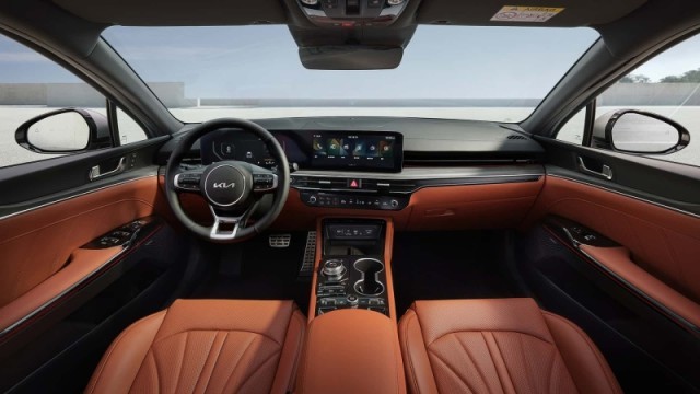 新款K5內(nèi)部同樣采用了最新的設(shè)計風(fēng)格,并使用雙拼配色,還在中控臺及門板等處運用大量軟質(zhì)材料進行包覆,整體極具質(zhì)感。另外,新車還配備由12.3英寸全液晶儀表+12.3英寸中控屏組成的雙聯(lián)屏系統(tǒng),搭配三輻式多功能方向盤和觸控式空調(diào)控制面板及HUD抬頭顯示系統(tǒng)實用性、科技感較強。動力方面,該車將提供包含1.6T和2.0L混動在內(nèi)的多種動力組合可選。