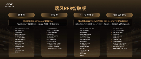 本次廣州車展,江淮瑞風現(xiàn)場首發(fā)瑞風RF8智聆版,涵蓋燃油與PHEV插混四款車型。PHEV旗艦型,預售價格為23.99萬;PHEV尊貴型,預售價格21.99萬;燃油旗艦型,預售價格18.99萬;燃油尊貴型,預售價格16.99萬。