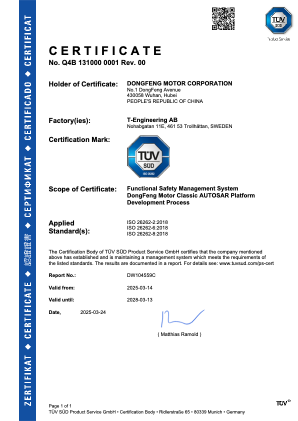 近日,東風汽車自主經典AUTOSAR基礎軟件平臺開發(fā)流程成功獲得國際獨立第三方檢驗、檢測和認證機構——TüV南德意志集團頒布的ISO 26262 ASIL-D級流程認證證書。這是東風汽車在智能網聯(lián)汽車核心軟件領域取得的重大突破,為構建安全、可靠、智能的汽車電子生態(tài)提供了堅實保障。