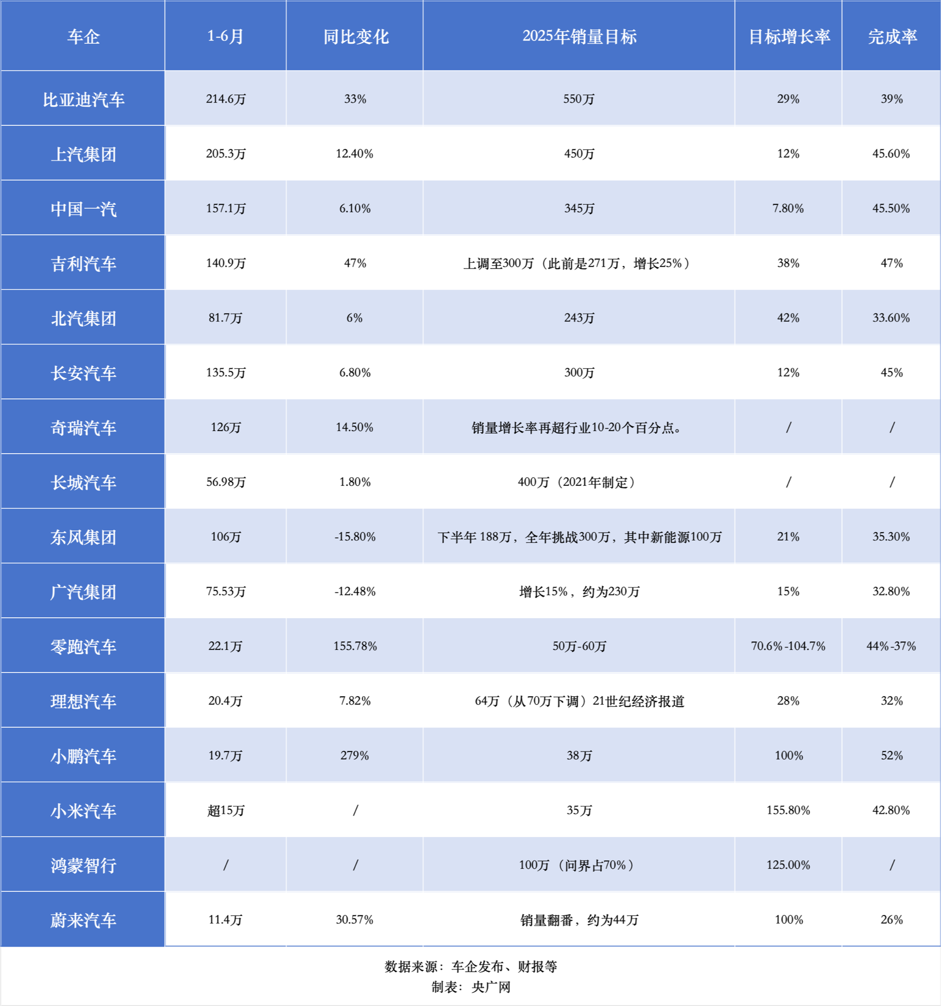 央廣網(wǎng)統(tǒng)計(jì)的各大汽車集團(tuán)、車企公布的銷量數(shù)據(jù),目前,蔚來(lái)汽車的目標(biāo)完成率低于30%,比亞迪汽車、北汽集團(tuán)、東風(fēng)集團(tuán)、廣汽集團(tuán)、理想汽車5家車企的目標(biāo)完成率在30%-40%之間,上汽集團(tuán)、中國(guó)一汽、吉利集團(tuán)、長(zhǎng)安汽車、零跑汽車、小鵬汽車、小米汽車7家車企的完成率超過(guò)40%。此外,奇瑞集團(tuán)、長(zhǎng)城汽車、鴻蒙智行等因數(shù)據(jù)不完善此次不計(jì)入統(tǒng)計(jì)。
