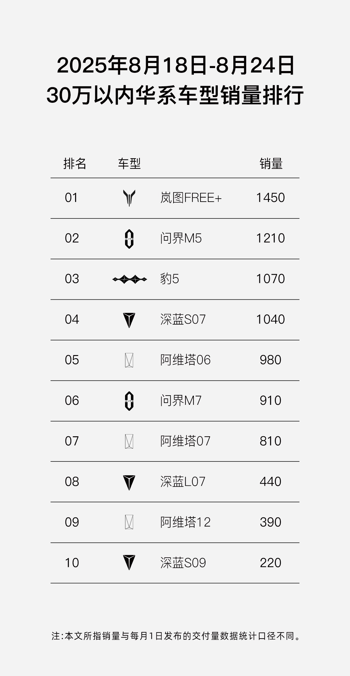 央廣網(wǎng)北京8月27日消息(記者姜鵬)8月第三周(8月18日-8月24日),嵐圖FREE+再創(chuàng)銷量佳績:單周銷量達(dá)到1450輛,再次奪得第34周“30萬內(nèi)華系車型銷冠”,并強(qiáng)勢躋身20-30萬級(jí)混動(dòng)SUV銷量 Top2。截至8月24日,嵐圖FREE+當(dāng)月累計(jì)銷量已達(dá)4110輛,穩(wěn)坐30萬以內(nèi)華系車型銷量Top1。