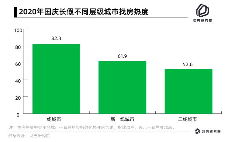一個(gè)城市房產(chǎn)經(jīng)紀(jì)人帶客戶(hù)看房量——總帶看量,是衡量樓市熱度重要指標(biāo)。10月1日-7日,一線(xiàn)城市找房熱度高于新一線(xiàn)、二線(xiàn)城市。從城市之間熱度比較看,四個(gè)一線(xiàn)城市總帶看熱度指數(shù)為82.3,明顯高于新一線(xiàn)城市的61.9和二線(xiàn)城市52.6。