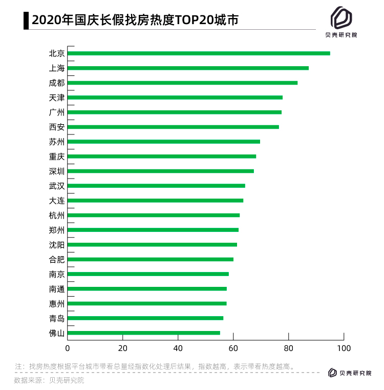 具體城市來(lái)看,一線(xiàn)城市中,北京、上??値Э礋岫戎笖?shù)分別為95和87.24,位居全國(guó)之首;深圳總帶看熱度指數(shù)為67.37,在四個(gè)一線(xiàn)城市中排在最后。
