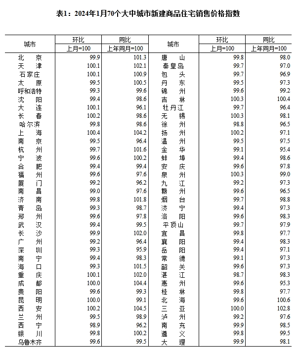 中新網(wǎng)2月23日電 國家統(tǒng)計局網(wǎng)站發(fā)布2024年1月份70個大中城市商品住宅銷售價格變動情況。國家統(tǒng)計局城市司統(tǒng)計師王中華解讀表示,2024年1月份,70個大中城市中商品住宅銷售價格環(huán)比下降城市個數(shù)減少,商品住宅銷售價格環(huán)比降幅整體收窄、同比整體延續(xù)降勢。