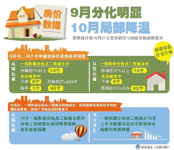 新華社北京10月21日電(記者王希)國家統(tǒng)計(jì)局21日發(fā)布的住宅銷售價(jià)格數(shù)據(jù)顯示,9月份70個(gè)大中城市房價(jià)分化明顯,10月份一線和部分熱點(diǎn)二線城市有針對(duì)性地實(shí)施調(diào)控政策,房地產(chǎn)市場(chǎng)明顯降溫。