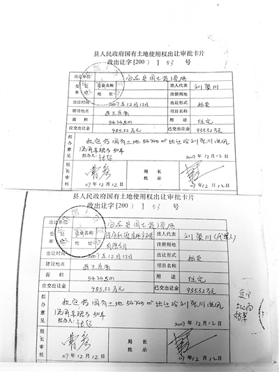土地檔案中《國有土地使用權(quán)出讓審批卡片》與劉聚川提供的原件復印件對比。記者 朱旭東 攝