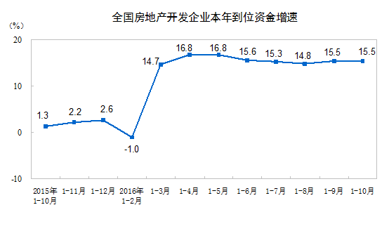 1-10月份,房地產(chǎn)開(kāi)發(fā)企業(yè)到位資金117261億元,同比增長(zhǎng)15.5%,增速與1-9月份持平。其中,國(guó)內(nèi)貸款17303億元,增長(zhǎng)1.2%;利用外資123億元,下降49.0%;自籌資金40764億元,增長(zhǎng)0.6%;其他資金59071億元,增長(zhǎng)35.2%。在其他資金中,定金及預(yù)收款33655億元,增長(zhǎng)32.2%;個(gè)人按揭貸款19783億元,增長(zhǎng)51.5%。