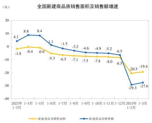 1—3月份,新建商品房銷售面積22668萬平方米,同比下降19.4%,其中住宅銷售面積下降23.4%。新建商品房銷售額21355億元,下降27.6%,其中住宅銷售額下降30.7%。