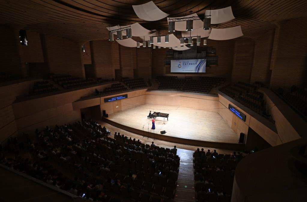當(dāng)日,首屆天津音樂節(jié)推出“唱支山歌給黨聽”民族歌劇選段音樂會(huì),天津歌舞劇院的演員們?cè)谔旖虼髣≡撼憽逗楹舜蚶恕贰都t梅贊》《唱支山歌給黨聽》等經(jīng)典曲目。