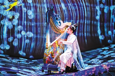 以往的音樂會中,觀眾是在固定位置坐著聽,而在沉浸音樂會《只此一夢》上,現(xiàn)場的觀眾跟隨著指引不斷行進,從而開啟了一種新的聽音樂和逛展覽的模式。例如,《無窮無盡的水晶宇宙》本來就是北京teamLab無相藝術(shù)空間的網(wǎng)紅打卡點,如水晶雨滴一般的視覺呈現(xiàn),配合琵琶叮咚如玉珠散落水晶盤中,竹笛聲悠揚似鷓鴣穿飛瓊林苑里,正是玉樹瓊枝點點鳥,珠花盛開鷓鴣飛!《只此一夢》沉浸音樂會是可以聽的畫面,是可以看的音符,觀眾與樂手可謂“零距離”。