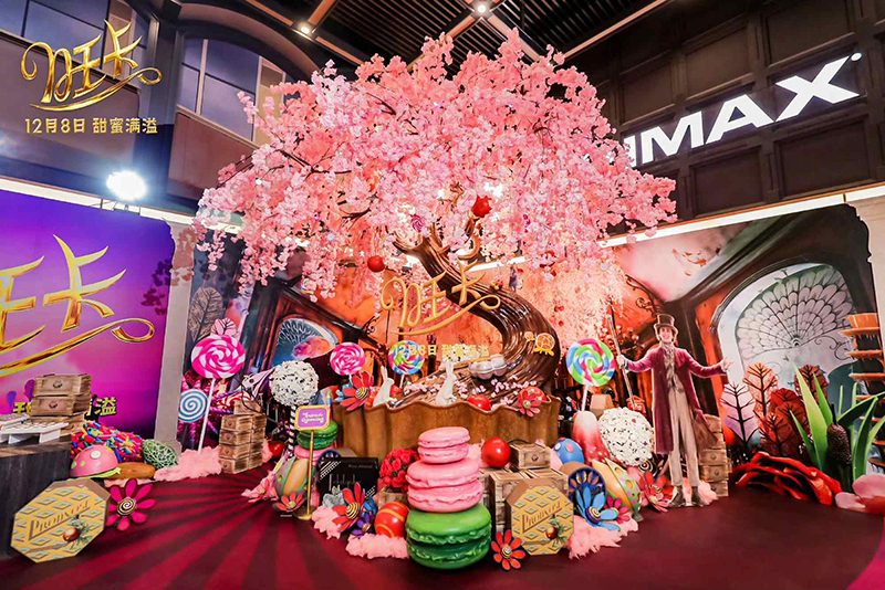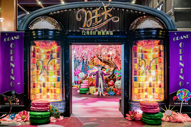 《旺卡》首映禮現(xiàn)場的設計獨具巧思,直接將電影中的旺卡巧克力店“搬到”影城。觀眾手持旺卡巧克力店“開業(yè)”邀請函,穿過大門,就步入旺卡巧克力店,正式開啟繽紛奇趣的童話世界,令人一秒忘記所有煩惱。