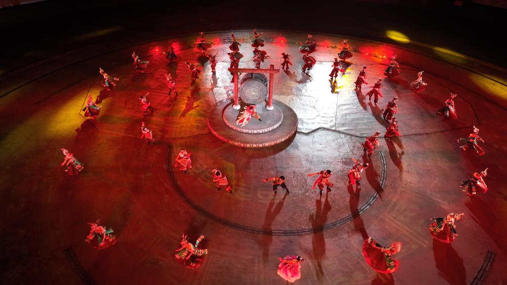 9月20日晚,演員在貴州省雷山縣大塘鎮(zhèn)表演苗族歌舞詩(shī)劇《仰歐?!罚o人機(jī)照片)。新華社記者 楊文斌 攝